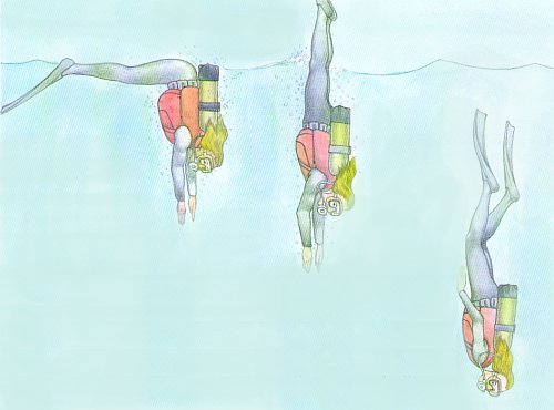 Спуск должен быть медленным и контролируемым: вам следует держать в поле зрения партнера, чтобы оставаться вместе, но при этом не столкнуться. Если вы испытываете трудности с выравниванием давления или что-то несете с собой, проще опускаться ногами вперед. Если вы утяжелены правильно, энергичного выдоха будет достаточно, чтобы начать спуск. Если проблем с давлением у вас нет, можете погружаться вертикально головой вниз. Так действуют опытные масочники; этот способ еще называют «по-утиному» или «по-щучьи».