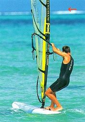 Иногда доска для виндсерфинга отказывается поворачиваться, и тогда приходится выполнять все движения из низкой стойки. Низкая стойка не только уравновешивает ваше положение и позволяет вам больше сопротивляться тяге паруса, но и помогает толкать доску носовой ногой. Ногу лучше ставить близко к основанию мачты с наветренной стороны. Толчок ногой поможет развернуть доску. Добирание и пампинг вперед скручивает парус, наполняет его ветром и перемещает центр парусности к носу. Благодаря этому нос отворачи вается от ветра. Но, наклоняя мачту вперед, не двигайтесь вперед вместе с ней. Как только доска встанет на новый курс, нужно вернуться к более удобной стойке с выпрямленной мачтой.